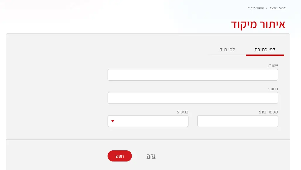 - רוצים לעשות חיפוש חדש או שמא עשיתם שגיאה בכתובת שהכנסתם? נא ללחוץ על הכפתור “נקה” ובצעו איפוס וחיפוש מיקוד מחדש!