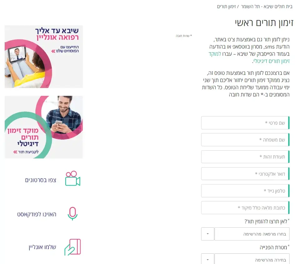 ג. מילוי טופס מקוון בלחיצה כאן שבו תצטרכו למלא שם פרטי, שם משפחה, תעודת זהות, דוא”ל,טלפון, כתובת מלאה כולל מיקוד, לאן תרצו להזמין תור (כאן תצטרכו לבחור את שם או תחום המרפאה הספציפית בבית החולים), לכתוב מה מטרת הפנייה ומהי בקשתך המפורטת, וגם לסמן אם זו פעם ראשונה במרפאה.