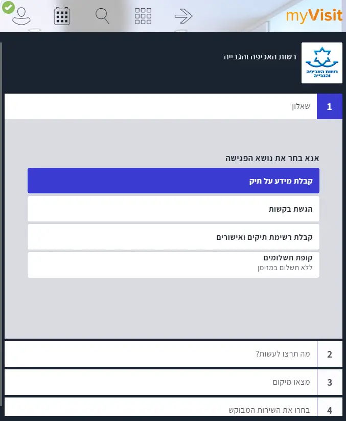 כמו כן האתר יבקש שתכתבו את הנושא של הפניה למשל קבלת מידע על התיק, הגשת בקשות, קבלת רשימת תיקים ואישורים או קופת תשלום.