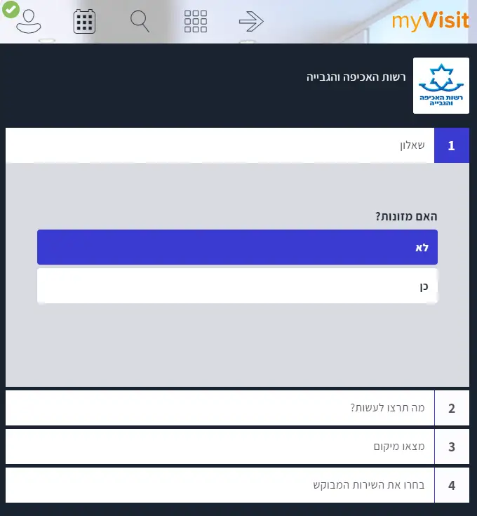 לאחר מכן תצטרכו לבחור את השירות התחום שאליו אתם מעוניינים לקבוע תור. אם סימנתם למשל חייבים בהוצאה לפועל השאלון ימשיך לשאלות נוספות למשל “האם קשור למזונות” ותצטרכו לסמן כן או לא.