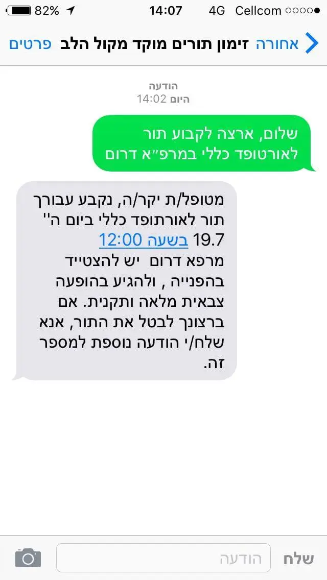 שליחת SMS לקביעת תור אונליין: 052-9990110 (שעות הפעילות 8:00-17:00 בימים א’-ה’).
